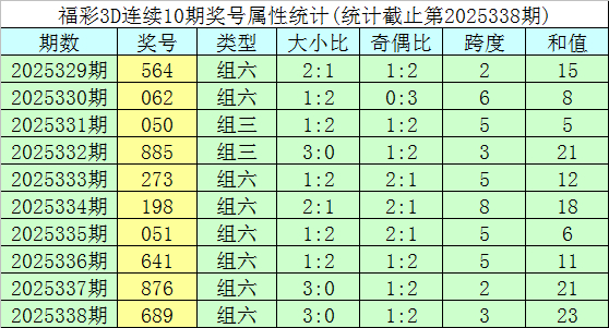 开奖归来:福彩3D第2025338期奖号为689。奖号模式为组六,大小模式为大大大,奇偶模式为偶偶奇,和值为23,跨度为3。