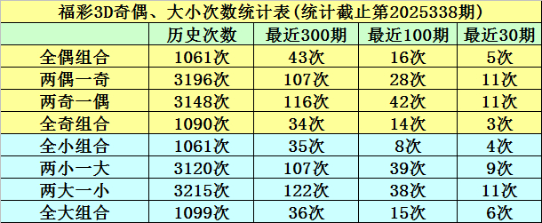 在前10期开奖中,全小组合出现0次,两小一大组合出现5次,两大一小组合出现2次,全大组合出现3次,本期展望开出两大一小组合。