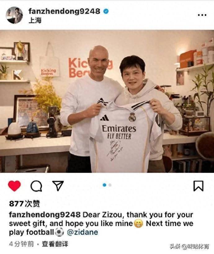 看成皇马球迷的樊振东在叮嘱媒体发帖展示了皆达内赠与我方的签名球衣,樊振东也将我方的的缅思款T恤和签名乒乓拍子送礼皆达内。
