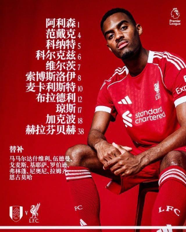 利物浦首发:阿利松/布拉德利、科纳特、范戴克、凯尔凯兹/赫拉芬贝赫、柯蒂斯·琼斯/索博斯洛伊、麦卡利斯特、维尔茨/哈克波